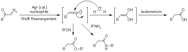 The key step of the Arndt-Eistert Homologation is the Wolff-Rearrangement of the diazoketones to ketenes, which can be accomplished thermally (over the range between r.t. and 750°C [Zeller, Angew. Chem. Int. Ed., 1975, 14, 32. DOI]), photochemically or by silver(I) catalysis. The reaction is conducted in the presence of nucleophiles such as water (to yield carboxylic acids), alcohols (to give esters) or amines (to give amides), to capture the ketene intermediate and avoid the competing formation of diketenes.